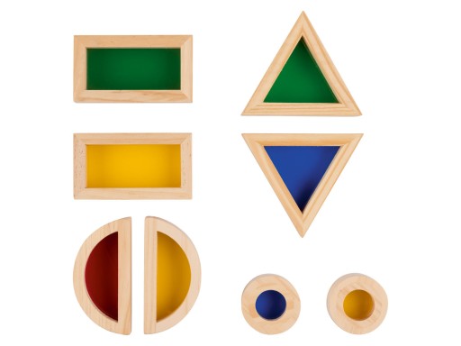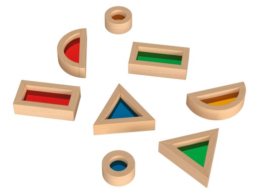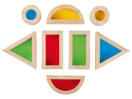 - drewniane klocki z półprzezroczystymi, kolorowymi okienkami z tworzywa sztucznego