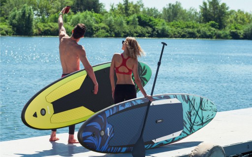 - Kompletny zestaw do pływania: pompowana deska do stand up paddle, pompka, wiosło, zestaw naprawczy, plecak, statecznik, siedzisko i smycz na kostkę