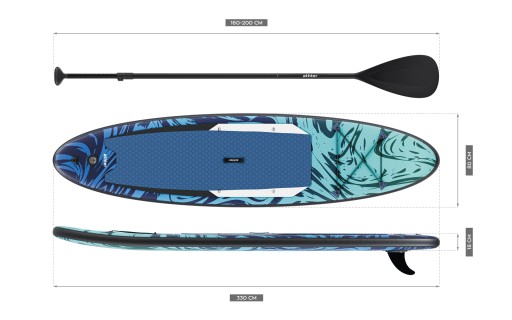 - Duże znaczenie ma ergonomiczny kształt deski SUP Athler, dzięki któremu sprawdzi się zarówno wtedy, gdy stawiasz pierwsze kroki, jak i jesteś bardziej zaawansowanym użytkownikiem. Szerokość powyżej 80 cm i długość 335 cm powodują, że to idealny wybór do relaksującego zwiedzania akwenów i aktywnego spędzania wolnego czasu.