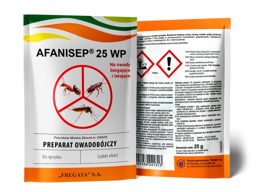 Preparat owadobójczy Afanisep 25 WP 25 g tu skuteczny środek owadobójczy zawierający aktywną substancję - permetrynę, zwalczającą insekty latarjące i biegające.