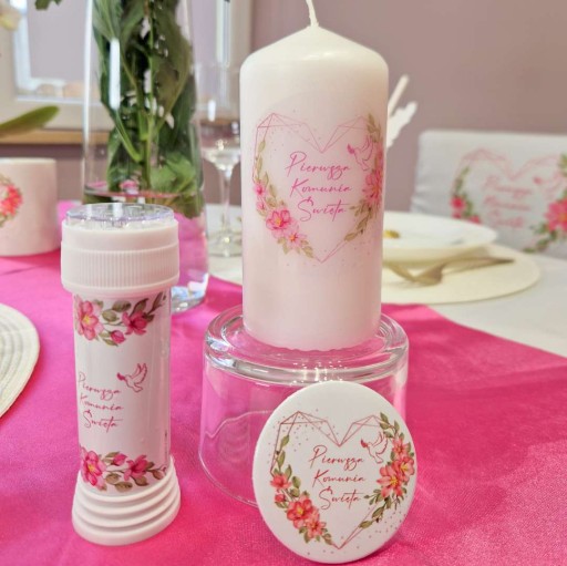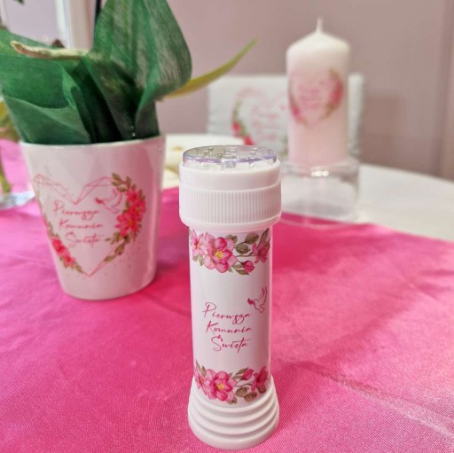 ✅ Komunijne Bańki mydlane z kolekcji Różowe Serce to klasyczny, zakręcany pojemnik z płynem do baniek oraz oczko na patyczku wewnątrz, przez które bańki się dmucha. Ta limitowana wersja z okazji Pierwszej Komunii zawiera nadruk na opakowaniu z motywem różowych kwiatów, a na środku znajduje się gołąbek i napis Pierwsza Komunia Święta.