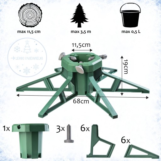 Wyjątkowy stojak choinkowy, który jest niezbędny do postawiania choinki bożonarodzeniowej. Mocny i trwały produkt daje możliwość utrzymania równowagi choinki ozdobionej mnóstwem dekoracji, bombek, serpentyn czy gwiazdek.