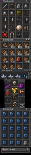 na EK założony F Axe, BoH, golden armor, knight legs, warrior helmet, d shield. Wiele rzeczy w depo(THAIS, i coś jeszcze wartego w ankrahmun, flame arrowy, poison arrowy i ?stealth ring?), lootbagi, stary k armor, noble armor etc. (4bp of UH) Skille to mankament: 65/61