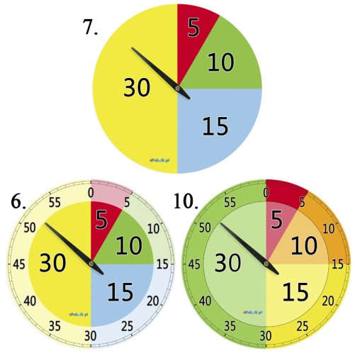 Dostępne wzory: UWAGA: WZORY nr 6, 7 i 10 są zegarami z tarczą w postaci Planu Daltońskiego. Zegary posiadają jedną dużą wskazówkę odmierzającą minuty. Pozwalają zrozumieć dzieciom długość upływającego czasu. Mają za zadanie zilustrować specjalną tarczą przedział czasowy 5-, 10-, 15-, 30- minutowy. Podczas pracy określamy kolorem czas na wykonanie zadania , ustawiając ręcznie wskazówkę na początku odpowiedniego koloru.