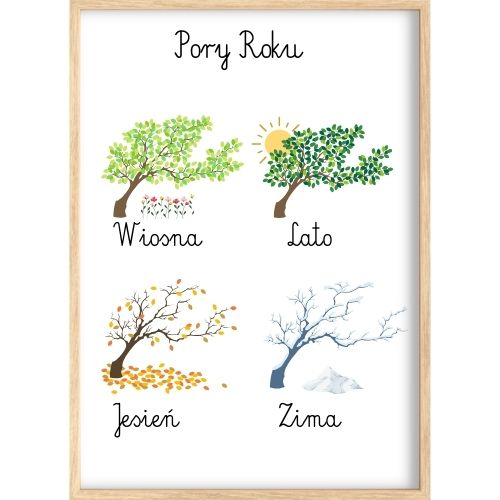 Przepiękny plakat z porami roku i ich podpisami to nie tylko doskonały element wystroju pokoju dziecięcego lub sali lekcyjnej, ale też cenna nauka, która utrwalana codziennie zapada w pamięć dziecka. Dzięki plakatowi dziecko w łatwy sposób nauczy się jakie rozróżniamy pory roku.