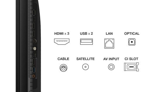 - Gniazda we/wy: 3 x HDMI,1 x RJ-45 LAN,1 x USB 3.0,1 x Gniazdo CI/Cl+,2 x Wejście antenowe,1 x Optical,1 x Satellite