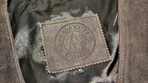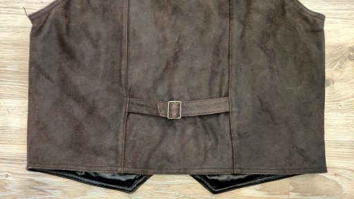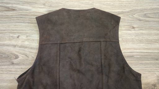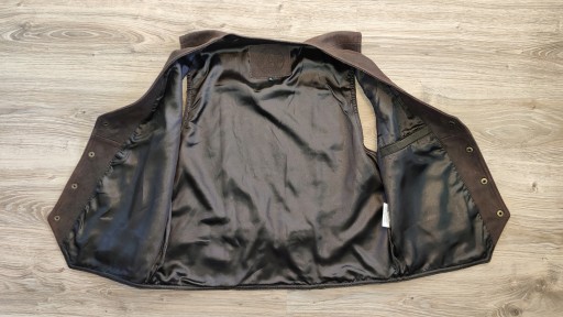 Kamizelka skórzana motocyklowa męska w b.dobrym stanie . Zapinana na guziki. Skóra matowa. Kolor brązowy. Wymiary długość-60cm, klatka-112cm. Rozmiar na metce XL