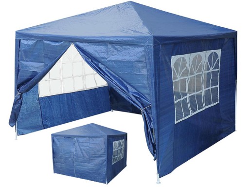 Pawilon ogrodowy - namiot handlowy 3x3m (niebieski) chroni przed nadmiernym słońcem i umiarkowanym deszczem. Wyjątkowo prosty i szybki w montażu. Wykonany z mocnego,odpornego na deszcz materiału. Pawilon idealny na imprezy w ogrodzie. Również świetny jako namiot handlowy. Złożony zajmuje niewiele miejsca. Bardzo krótki czas składania pomoże Ci szybko rozstawić lub złożyć pawilon.Nieprzemakalny materiał PE o gramaturze 110g/m2 (najgrubszy na rynku). Dodatkowym atutem naszego pawilonu jest od wielu lat sprawdzona konstrukcja. Rurki metalowe malowane proszkowo na kolor biały. Wszystkie potrzebne do złożenia elementy w komplecie (złączki, rurki, linki, śledzie, itd.).