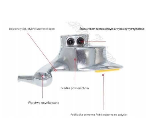 1. Jest to stalowa głowica montażowa i demontażowa z gumowymi podkładkami montażowymi stosowanymi w wielu montażownicach.