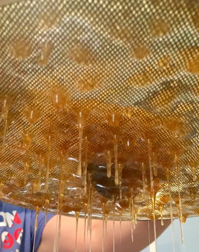 Górny filtr to gruba siatka, która wyłapuje duże cząstki, zanim miód wpłynie do dolnej drobnej siatki.