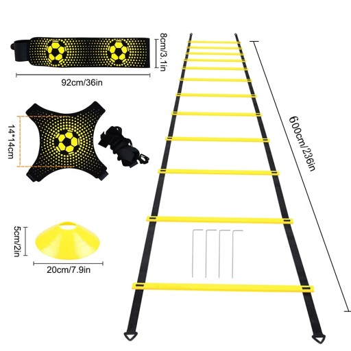 - Każdy zestaw zawiera drabinkę fitness o długości 6 m z 12 szczeblami, 12 pachołków piłkarskich (6 żółtych i 6 pomarańczowych), 1 kicker do piłki nożnej, 4 stalowe kolce zapewniające stabilność oraz torbę transportową.