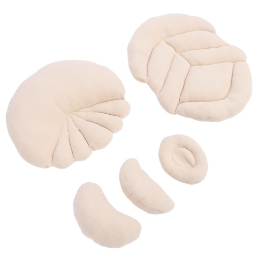5. Zestaw 5-częściowy: poduszki do fotografii noworodkowej obejmują poduszkę w kształcie liścia, poduszkę w kształcie muszli, dużą poduszkę w kształcie księżyca, małą poduszkę w kształcie księżyca i okrągłą poduszkę, zapewniając różnorodne urocze opcje.