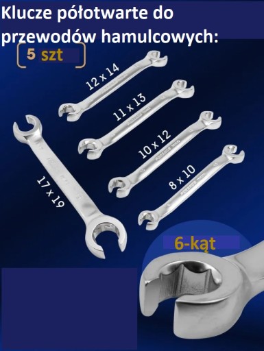 - klucze półotwarte do przewodów hamulcowych:8x10, 10 x 12, 11 x 13, 12 x 14, 17 x 19 ;
