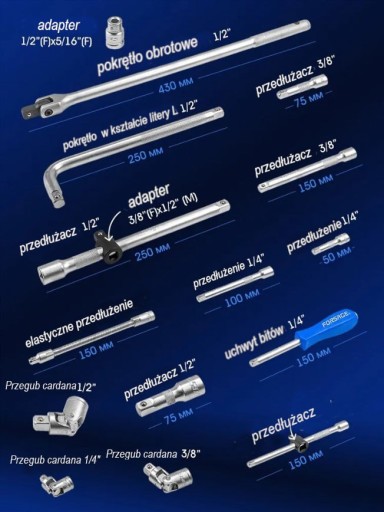 - zapadka 1/4 "; uchwyt 1/4" 150 mm; przedłużacze 1/4 ": 50, 100, 150 mm; elastyczne przedłużenie 1/4" 145 mm; przegub cardana 1/4 ";