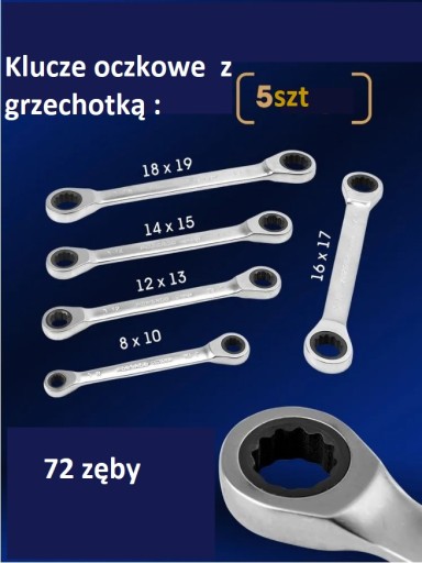 - klucze oczkowe odgięte z grzechotką :8 x 10, 12 x 13, 14 x 15, 16 x 17, 18 x 19;