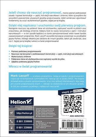 Jeżeli chcesz się nauczyć programować, musisz poznać podstawowe zasady i typowe konstrukcje -- pętle, instrukcje warunkowe i zmienne, które są wspólne dla wszystkich powszechnie używanych języków programowania. Jeżeli zamierzasz ugruntować fundamenty, by uczyć się konkretnych języków, sięgnij po tę książkę.Dzięki niej napiszesz i uruchomisz swój pierwszy program. Następnie nauczysz się pobierać dane od użytkownika, zapisywać wyniki w plikach oraz zrozumiesz, jak działają zmienne. Kolejny krok to nauka korzystania z pętli i instrukcji warunkowych -- w ten sposób będziesz w stanie zaimplementować wiele nawet bardzo zaawansowanych programów. Mark Lassoff wszystkie koncepcje prezentuje na przykładzie języka Python, którego składnia jest zbliżona do innych języków, takich jak: JavaScript, Java czy C. Sięgnij po tę książkę i wkrocz w świat programowania!Czytając niniejszą książkę i samodzielnie pisząc przedstawione w niej przykłady, opanujesz podstawy programowania. Swój pierwszy program napiszesz już w pierwszym rozdziale książki. W drugim rozdziale, poznasz podstawowe zagadnienia wejścia-wyjścia. W rozdziale trzecim zaczniesz korzystać ze zmiennych -- pojęcia mającego kluczowe znaczenie w każdym języku programowania. Rozdział czwarty został poświęcony instrukcjom warunkowym i pętlom; natomiast w piątym poznasz struktury, przeznaczone do przechowywania różnych rodzajów danych. W ostatnim, szóstym rozdziale książki zaczniesz tworzyć klasy i obiekty, poznając tym samym podstawy programowania obiektowego