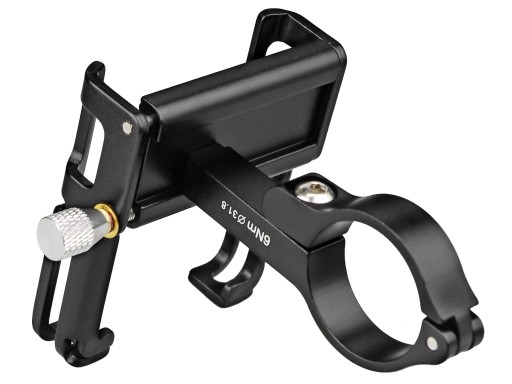 Solidny uchwyt wykonany w całości z aluminium, mocowany zaciskiem do kierownicy lub mostka. Wszystko łączone na śruby, co daje gwarancję stabilności nawet w trudnych warunkach jazdy. Możliwość montażu w pionie jak i w poziomie. Dopasowany do telefonów o szerokości od 55 do 100 mm.