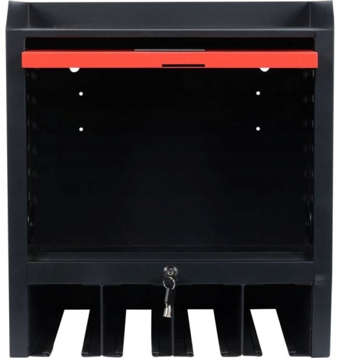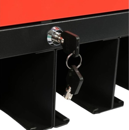 Do dyspozycji użytkownika jest zamykana na klucz półka górna oraz półka pod szafką z 4 kieszeniami do podwieszenia narzędzi.