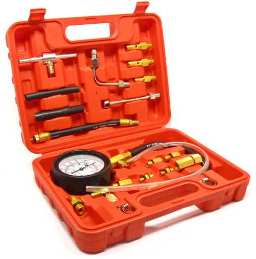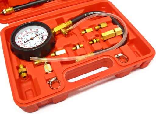 Zestaw zawiera adaptery i kształtki pasujące do większości układów wtrysku paliwa. Manometr z podwójną skalą: 0 - 140 psi oraz 0 - 10 bar.