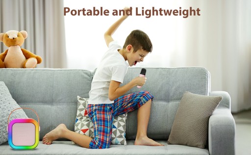 【Długi czas odtwarzania i niewielka waga】 Łatwy do przenoszenia, wbudowany akumulator, gwarantowane 5-10 godzin rozrywki. Kompaktowy rozmiar przenośnego głośnika to tylko 9*9*7 cm, a średnica uchwytu mikrofonu to zaledwie 3 cm, dzięki czemu z łatwością utrzyma nawet 3-letnią dziewczynkę. Rogi urządzenia do karaoke i mikrofonu są miękkie i gładkie, dzięki czemu są bezpieczne dla chłopców i dziewcząt.