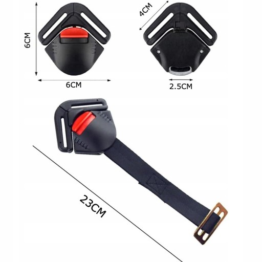 Długość całkowita wynosi 23cm, a szerokość klamry to 9cm. Górne otwory na pas mają szerokość 4cm, zapewniając wygodne dopasowanie do różnych rozmiarów pasa bezpieczeństwa dla dzieci.