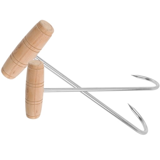 Haki T ze stali nierdzewnej z drewnianą rączką są solidne i profesjonalne, idealne dla rzeźników, szefów kuchni, przetwórców mięsa. Te haczyki z uchwytem T są idealnym narzędziem dla myśliwych, mistrzów grillowania i grillowania, kuchni restauracyjnych lub innych miejsc przygotowywania posiłków.