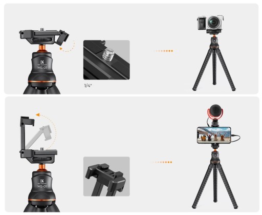 Giętki Statyw Elastyczny Głowica 3D Uchwyt Aparat Kamera Telefon K&F MS-01