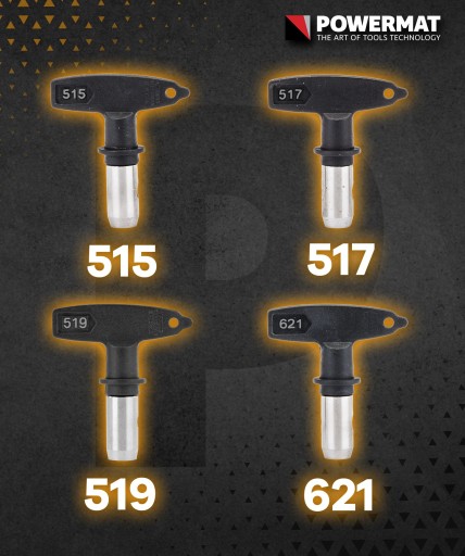 515, 517, 519: Dysze te są przeznaczone do farb na bazie wody, lateksowych i akrylowych.619: Ta dysza jest przeznaczona do farb olejnych i rozpuszczalnikowych.