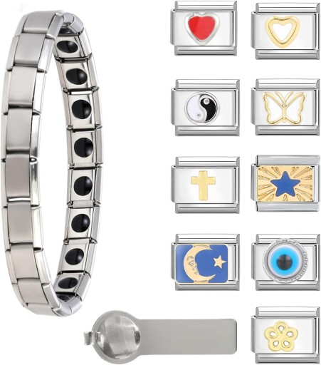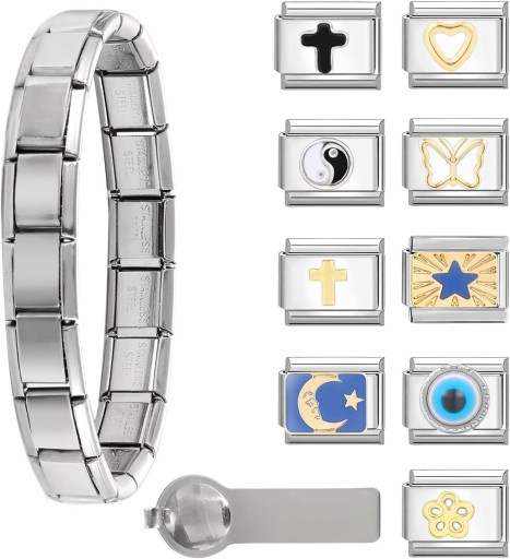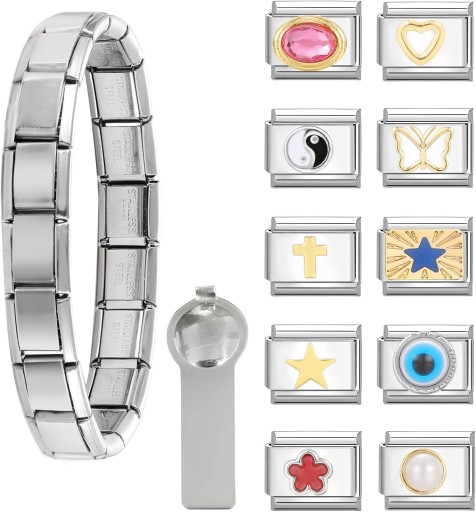 Ideal Bracelet and Tools: you will receive 1 Classical Itallan style charm braclet, 1 thumb charms tools, 9Pcs Popular 10mm*9mm Italian Charms; Each tool measures about 2.17 x 0.51 inches/ 55 x 13 mm,which is suitable for most bracelet sizes. It can complete the stitching of all 9mm accessories and can be interchanged and combined with other Italian Charms Compatible with other major brand Italian charms too. These stainless steel Italian charms are available in silver and gold colors and are made to last without rusting. The charms have retractable snaps inside, making it effortless to load and unload them. By DIYing Italian charms with your loved ones, you not only create a beautiful bracelet but also share enjoyable moments together. Product Description Enjoyable memories Assorted Colorful Charms Bracelet Sets Series