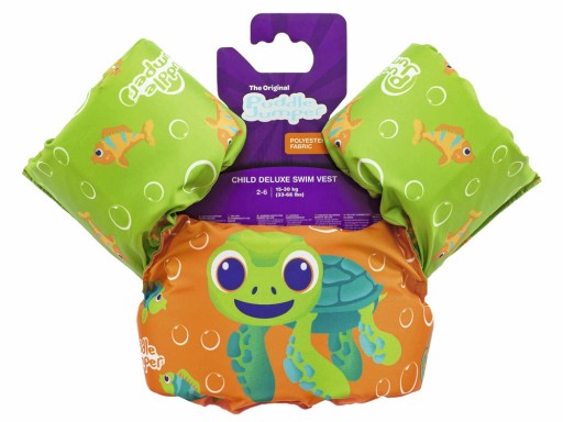 Ta kolorowa kamizelka z uroczą grafiką uśmiechniętego żółwika, idealna dla dzieci w wieku od 2 do 6 lat, pozwoli Twojemu dziecku bezpiecznie spędzić czas w wodzie obok rodzica, podczas letnich zabaw w basenie, jeziorze, morzu.