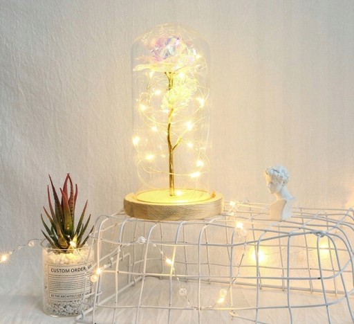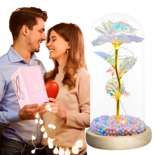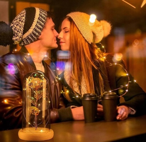 ✨ Lampki LED otaczają różę, delikatnie podkreślając jej piękno i wyjątkowy urok. Dzięki nim kwiat staje się jeszcze bardziej efektowny, emanując subtelnym światłem, które dodaje mu magicznego blasku.