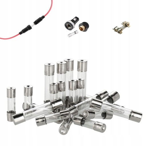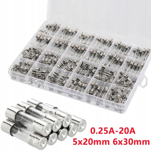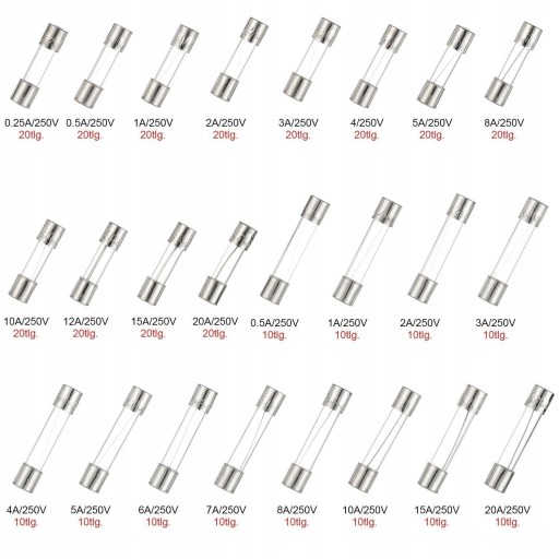 5 x 20 mm: 0,25 A, 0,5 A, 1 A, 2 A, 3 A, 4 A, 5 A, 8 A, 10 A, 12 A, 15 A, 20 A (po 20 sztuk).