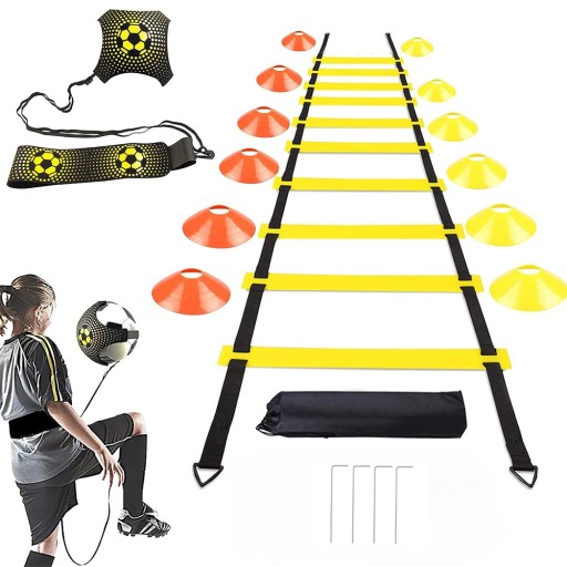 ⚽ 【Kompletny pakiet treningu sportowego】 Ćwiczenia pracy nóg poprawiające umiejętności piłkarskie, to kompleksowe narzędzie do treningu piłkarskiego. Każdy zestaw zawiera drabinkę do ćwiczeń o długości 6 m z 12 szczeblami, 12 pachołków piłkarskich (6 żółtych i 6 pomarańczowych), 1 przyrząd do kopania piłki nożnej, 4 stalowe kołki zwiększające stabilność oraz torbę transportową.