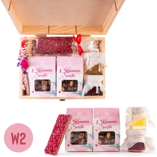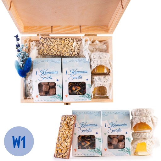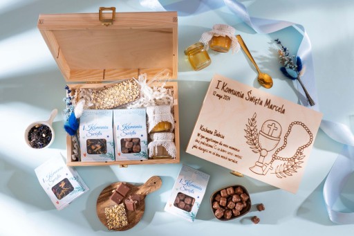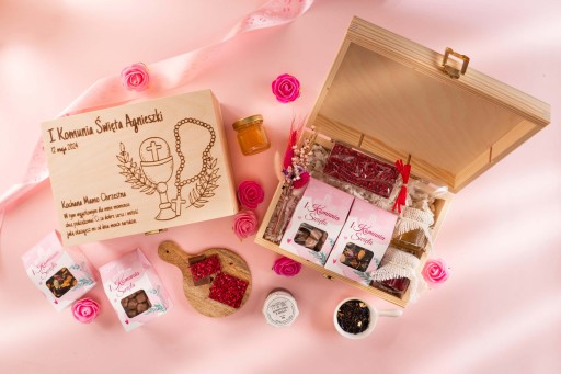 Zestaw prezentowy w skrzynce dostępny w dwóch motywach z okazji I Komunii Świętej, świetny pomysł jako prezent w ramach podziękowania dla