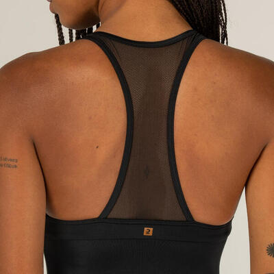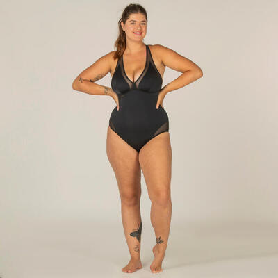 Zespół surferek na różnych poziomach umiejętności stworzył ten damski kostium kąpielowy dla zaawansowanych, surfujących na każdym typie fal. Ten jednoczęściowy kostium został pomyślany dla surferek; łączy on w sobie komfort wiosłowania dzięki mocno odsłoniętym plecom i kobiecość za sprawą zaszewek i przejrzystych wstawek.