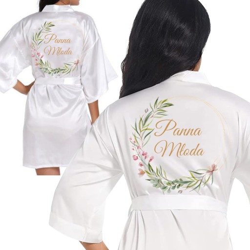 Szlafrok "Panna Młoda" to wyjątkowa kreacja, która emanuje kobiecością i elegancją. Jego głównym elementem ozdobnym jest kwiatowy wianek, który nadaje mu delikatności i romantycznego charakteru. Dodatkowo, złoty napis "Panna Młoda" dodaje mu wyjątkowego uroku i podkreśla jego przeznaczenie.