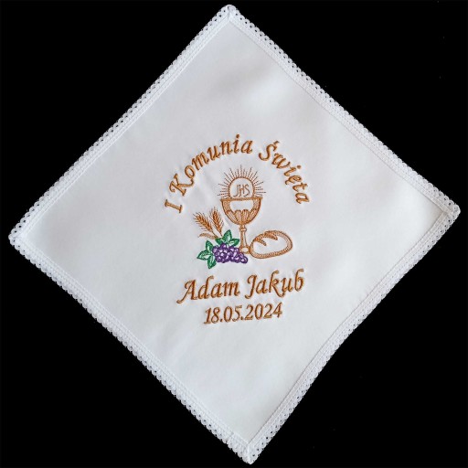 Chusteczka z Twoim indywidualnym haftem (imieniem dziecka, datą I Komunii Świętej, grafiką)