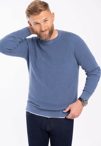 Niebieski sweter męski został uszyty z bawełny. To sprawa, że jest miękki w dotyku, przyjemny dla skóry i zapewnia wysoki poziom komfortu podczas noszenia. Naturalna dzianina jest również bardziej przewiewna, co pozwala skórze oddychać.