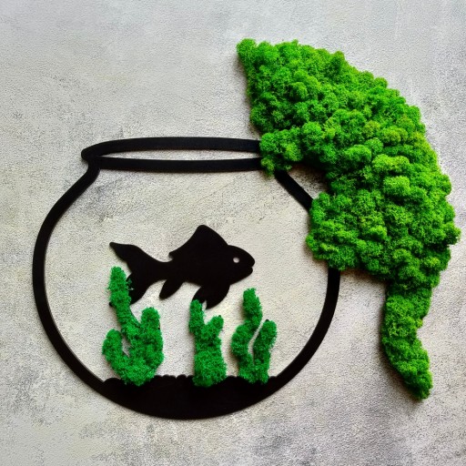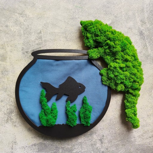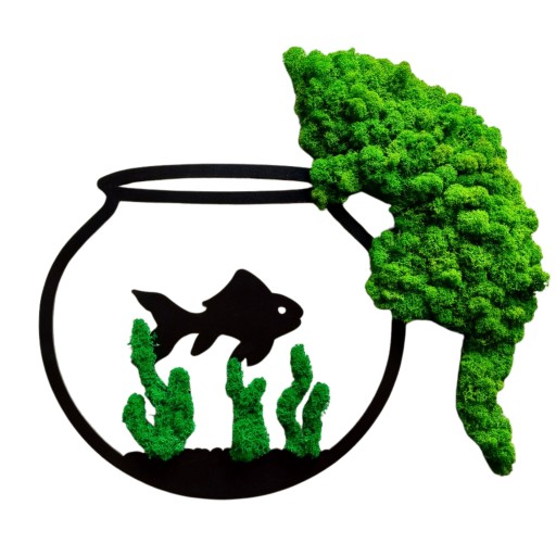 Obraz z rybką w akwarium i kotkiem ozdobionym mchem. Propozycja dla osób, które szukają ciekawego elementu do aranżacji swojego mieszkania lub nietuzinkowego prezentu. Nasze obrazy zdobione chrobotkiem reniferowym są naturalne i z pewnością zrobią wrażenie na gościach lub klientach. Postaw na coś unikalnego.