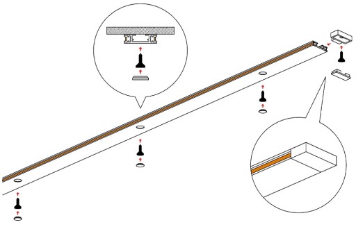 W szynie montażowej wbudowany jest płaskownik. Połączenia następuje poprzez wpięcie oprawy świetlnej w szynę. Takie połączenie nie wymaga żadnych narzędzi. Wszystkie systemy oświetleniowe w jednej szynie zapalają się jednocześnie.