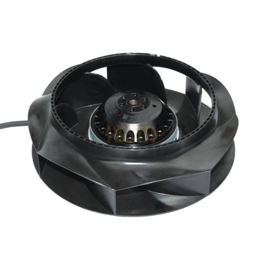 Wentylator do klimatyzatora DOMETIC dmuchawa z poziomym trzpieniem, wirnikiem w dolnej części z otworami wylotowymi kondensatu. Czarny wirnik, śmigło do skraplacza klimatyzacji postojowej, do kampera, kempingu, przyczepy kempingowej, dmuchawa, klimatyzator postojowy, dachowy, samochodowy, ebmpapst, R2E220-RA38-12. Model: FJ1700, FJ1700AM, FJ1700eIR, FJ2200, FJ2200T, FJ2200AM, FJ2200OE, FJ2200eIR