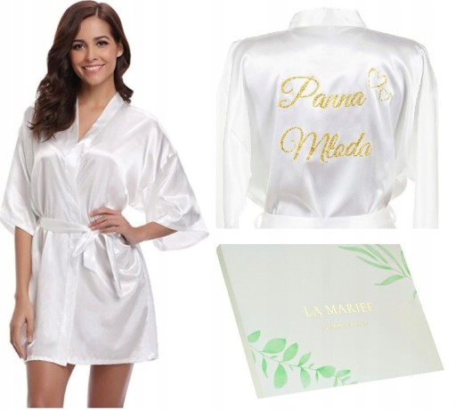 Szlafrok "Panna Młoda" jest starannie zapakowany w eleganckie białe pudełko, które ozdobione jest złotym napisem, harmonizującym z charakterem samego szlafroka. To estetyczne i stylowe opakowanie dodaje całej prezentacji wyjątkowego blasku i elegancji.
