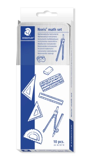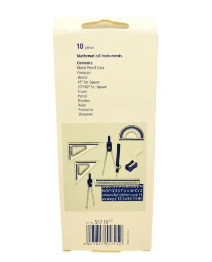 • zestaw zawiera: : cyrkiel, 2 ekierki (45° i 30° /60° ), przenośnik, linijkę 15 cm, kątomierz, szablon literowo-cyfrowy, temperówkę, gumkę, mały ołówek do cyrkla