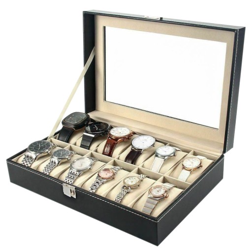 Eleganckie pudełko posiada 12 przegródek na okulary na zegarki, w których można umieścić również inną biżuterię. Kasetka ma elegancki, czarny kolor i białe szwy, co dodaje całości elegancji i stylu. Wieczko etui jest przezroczyste, dzięki temu pudełko na zegarki możemy wykorzystać nie tylko do przechowywania i zachowania porządku, ale również do eleganckiego eksponowania zawartości.