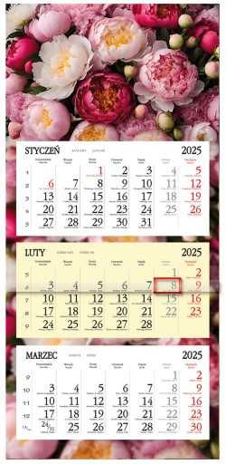 - układ: 3 miesiące na stronie (miesiąc bieżący, poprzedni i następny) w oddzielnych bloczkach.
