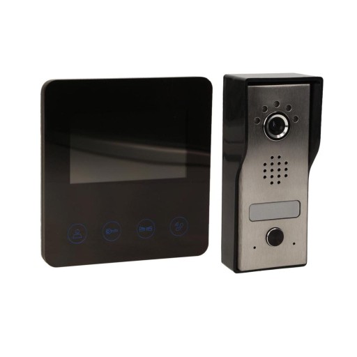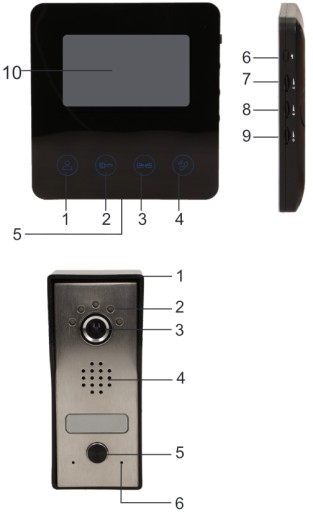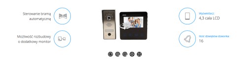 Zestaw wideodomofonowy kolorowy, ultra płaski monitor bezsłuchawkowy LCD 4,3", dotykowy panel monitora z podświetlanymi przyciskami, płynna regulacja parametrów monitora (jasności i nasycenia koloru obrazu oraz głośności rozmowy), 16 dźwięków dzwonka do wyboru, kamera do montażu natynkowego, daszek ochronny w zestawie, miejsce na nazwisko, oświetlenie jasnymi diodami LED umożliwia widzenie w nocy, funkcja interkomu po zastosowaniu dodatkowego monitora, dodatkowe sterowanie bramą, zasilanie prądem stałym z zasilacza 12V DC, elektrozaczep nie wymaga dodatkowego zasilania.
