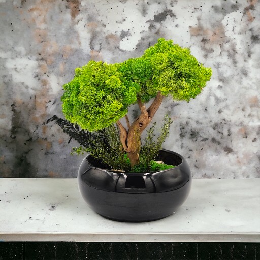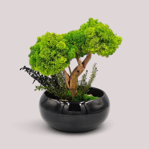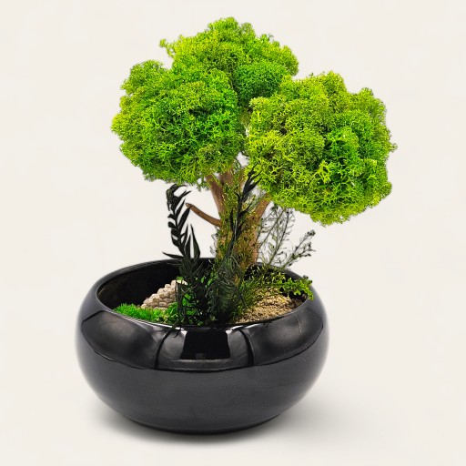 Drzewko z mchu to kompozycja z chrobotka w kolorze jasnej zieleni z dodatkiem roślin stabilizowanych z przepięknym egzotycznym azjatyckim korzeniem.
