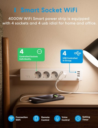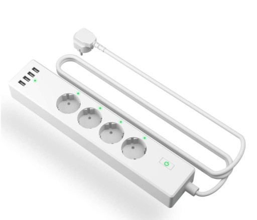 - 16A MEROSS SMART MULTIPLE SOCKET SZYNA - 4 inteligentne gniazda można przełączać niezależnie, a tym samym indywidualnie sterować 4 podłączonymi urządzeniami. 4 porty USB można włączać i wyłączać razem. Szybkie ładowanie USB spełnia wiele celów.