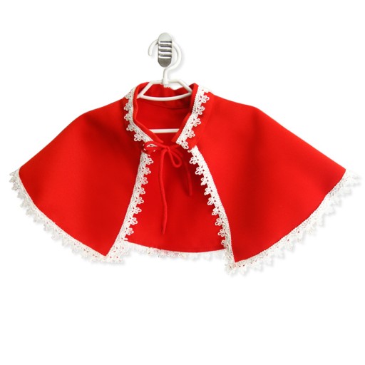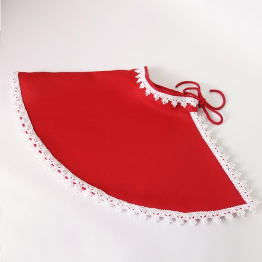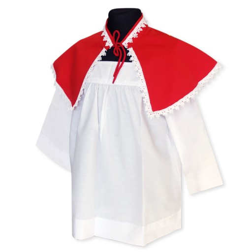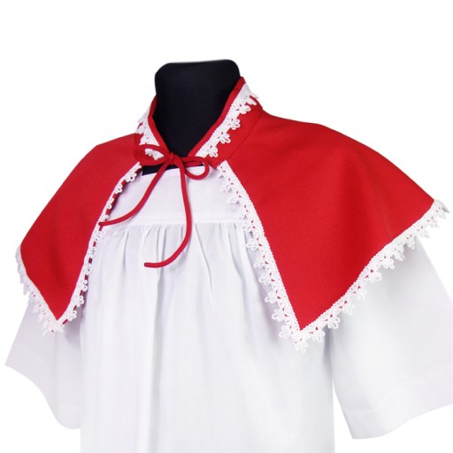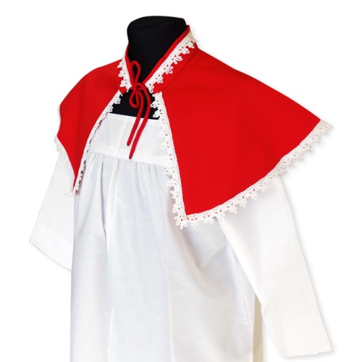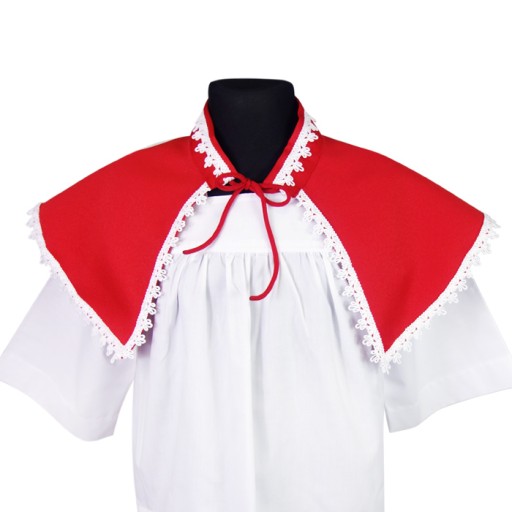 Chłopięcy kołnierzyk / kapturek na procesję Bożego Ciała w kolorze czerwonym, uszyte z materiału typu strecz, obszyte białą, ozdobną koroneczką. Kołnierzyk wiązany z przodu sznureczkami.