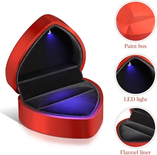 - zawiera lampkę led o zimnej barwie, która zapala się automatycznie po otwarciu pudełka i pięknie podświetla pierścionek